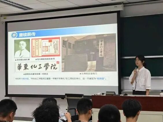 我熟稔校史,主要以讲故事的独特形式开启校史课堂,曾为2025级化工学院本科生宣讲校史和担任奉贤博物馆主题展览讲解员等,希望通过我的讲解来宣传华理校史,让学弟学妹们更好的了解华理校史。